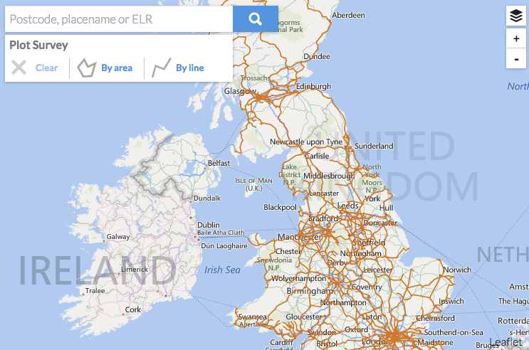 To get down to your area of interest quickly you can use the Search tool. Simply enter your search criteria in the search box and click the magnifying glass icon. Acceptable search terms are place name, postcode, and ELR reference: